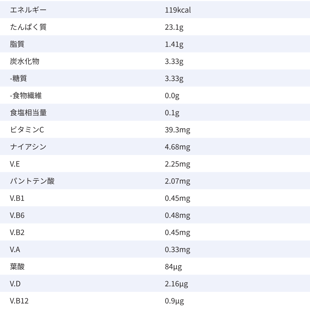 エネルギー 119kcal たんぱく質 23.1g 脂質 1.41g 炭水化物 3.33g -糖質 3.33g -食物繊維 0.0g 食塩相当量 0.1g ビタミンC 39.3mg ナイアシン 4.68mg V.E 2.25mg パントテン酸 2.07mg V.B1 0.45mg V.B6 0.48mg V.B2 0.45mg V.A 0.33mg 葉酸 84μg V.D 2.16μg V.B12 0.9μg
