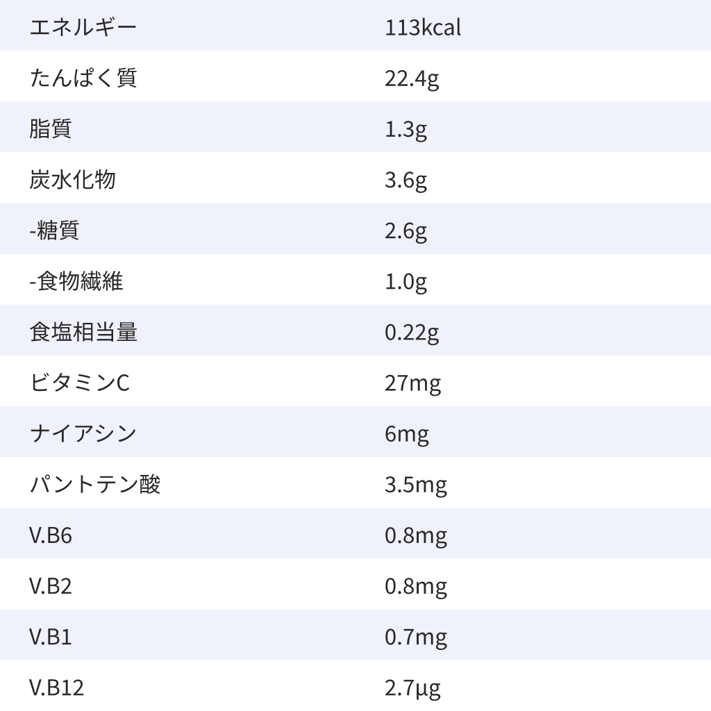 エネルギー 113kcal たんぱく質 22.4g 脂質 1.3g 炭水化物 3.6g -糖質 2.6g -食物繊維 1.0g 食塩相当量 0.22g ビタミンC 27mg ナイアシン 6mg パントテン酸 3.5mg ビタミンB6 0.8mg ビタミンB2 0.8mg ビタミンB1 0.7mg ビタミンB12 2.7μg