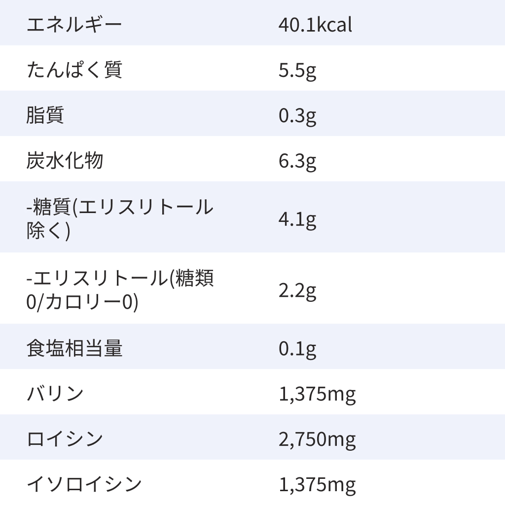 エネルギー 40.1kcal たんぱく質 5.5g 脂質 0.3g 炭水化物 6.3g -糖質(エリスリトール除く) 4.1g -エリスリトール(糖類0/カロリー0) 2.2g 食塩相当量 0.1g バリン 1,375mg ロイシン 2,750mg イソロイシン 1,375mg