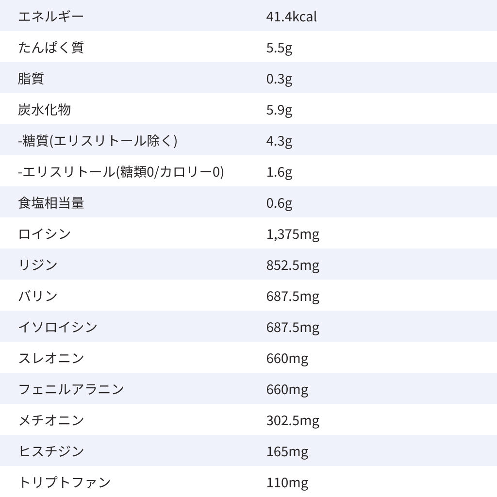 エネルギー 41.4kcal たんぱく質 5.5g 脂質 0.3g 炭水化物 5.9g -糖質(エリスリトール除く) 4.3g -エリスリトール(糖類0/カロリー0) 1.6g 食塩相当量 0.6g ロイシン 1,375mg リジン 852.5mg バリン 687.5mg イソロイシン 687.5mg スレオニン 660mg フェニルアラニン 660mg メチオニン 302.5mg ヒスチジン 165mg トリプトファン 110mg
