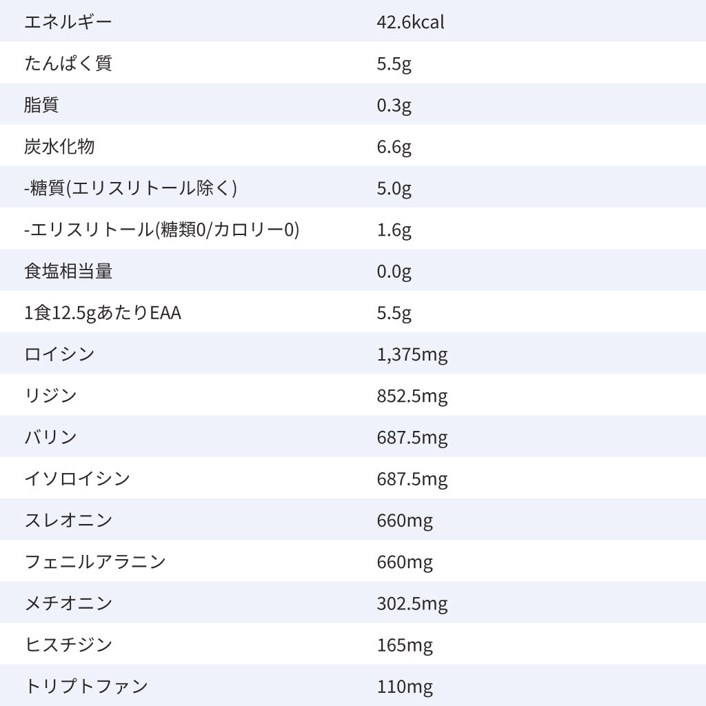 エネルギー 42.6kcal たんぱく質 5.5g 脂質 0.3g 炭水化物 6.6g -糖質(エリスリトール除く) 5.0g -エリスリトール(糖類0/カロリー0) 1.6g 食塩相当量 0.0g 1食12.5gあたりEAA 5.5g ロイシン 1,375mg リジン 852.5mg バリン 687.5mg イソロイシン 687.5mg スレオニン 660mg フェニルアラニン 660mg メチオニン 302.5mg ヒスチジン 165mg トリプトファン 110mg