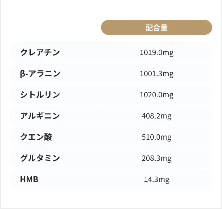 マルトデキストリン(国内製造)、β-アラニン、クレアチン一水和物、L-シトルリン、エリスリトール、マルチトール、食塩、パラチノース、デキストリン、HMBカルシウム、クロレラ/L-ロイシン、L-イソロイシン、L-バリン、L-リジン塩酸塩、甘味料(ステビア)、香料、クエン酸、L-アルギニン、L-フェニルアラニン、リンゴ酸、L-トレオニン、L-メチオニン、L-グルタミン、L-ヒスチジン、乳化剤(乳・大豆由来)、L-トリプトファン