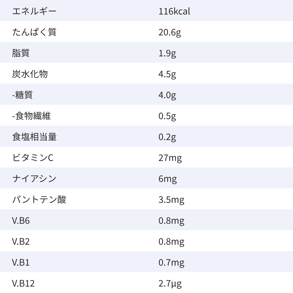 エネルギー 116kcal たんぱく質 20.6g 脂質 1.9g 炭水化物 4.5g -糖質 4.0g -食物繊維 0.5g 食塩相当量 0.2g ビタミンC 27mg ナイアシン 6mg パントテン酸 3.5mg V.B6 0.8mg V.B2 0.8mg V.B1 0.7mg V.B12 2.7μg