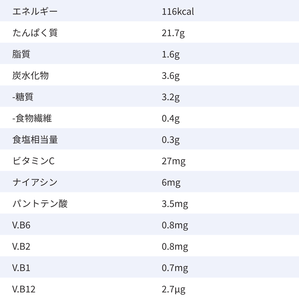 エネルギー 116kcal たんぱく質 21.7g 脂質 1.6g 炭水化物 3.6g -糖質 3.2g -食物繊維 0.4g 食塩相当量 0.3g ビタミンC 27mg ナイアシン 6mg パントテン酸 3.5mg V.B6 0.8mg V.B2 0.8mg V.B1 0.7mg V.B12 2.7μg