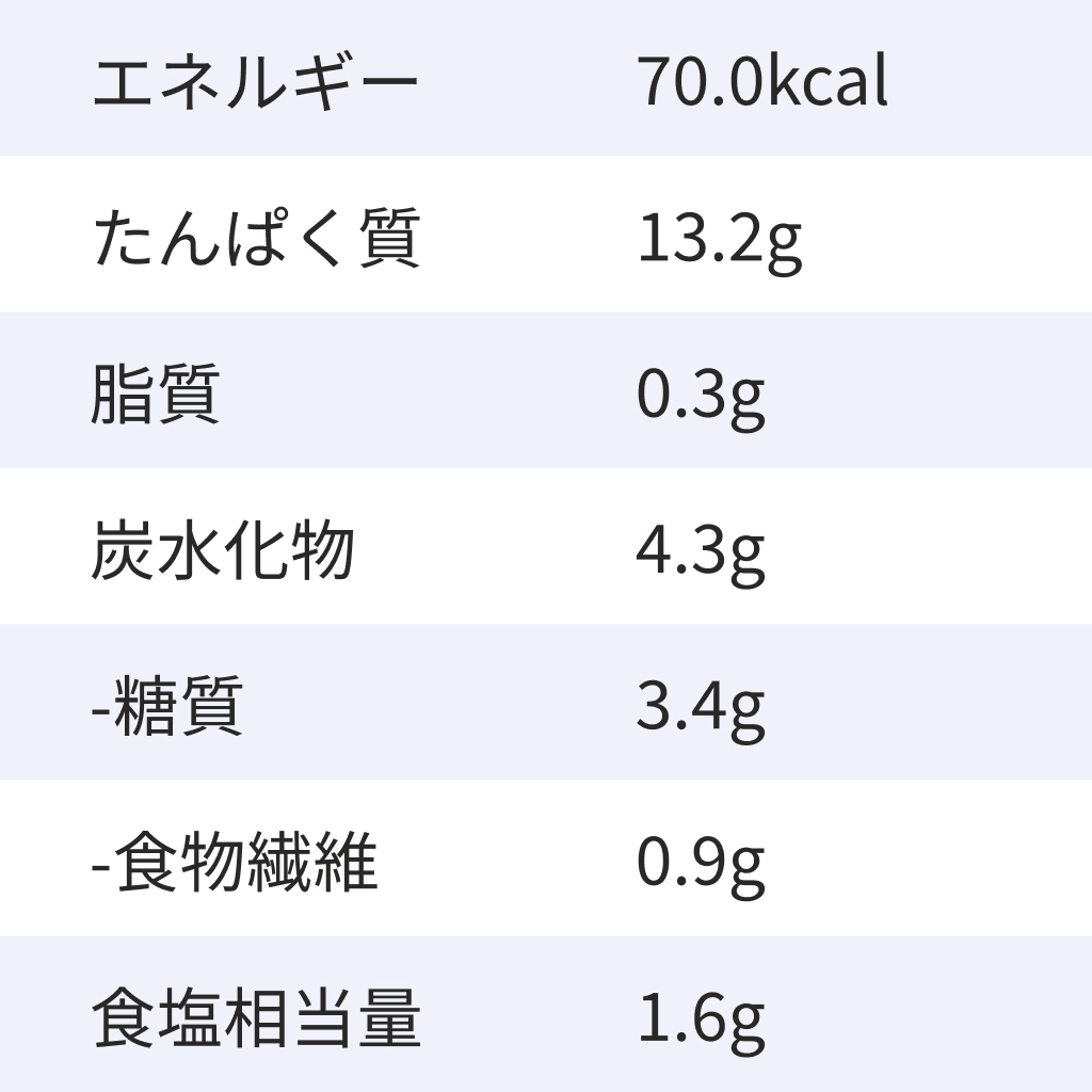 エネルギー 70.0kcal たんぱく質 13.2g 脂質 0.3g 炭水化物 4.3g -糖質 3.4g -食物繊維 0.9g 食塩相当量 1.6g