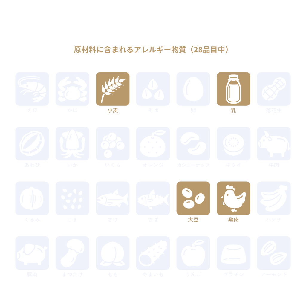 大豆たんぱく(国内製造)、豆板醤パウダー{デキストリン、豆板醤ペースト(小麦・大豆を含む)}、チキンエキスパウダー(デキストリン、チキンエキス、食塩、酵母エキスパウダー)、酵母プロテイン濃縮物、花椒粉末(花椒、陳皮)、食塩、難消化デキストリン、乾燥もやし(もやし、ぶどう糖、乳糖)、乾燥ちんげん菜(ちんげん菜、ぶどう糖)、ガーリックエキスパウダー(デキストリン、ニンニクエキス)/調味料(アミノ酸)、香辛料抽出物、増粘剤(グァーガム)、乳化剤(乳・大豆由来)、着色料(カロテノイド)、甘味料(ステビア)