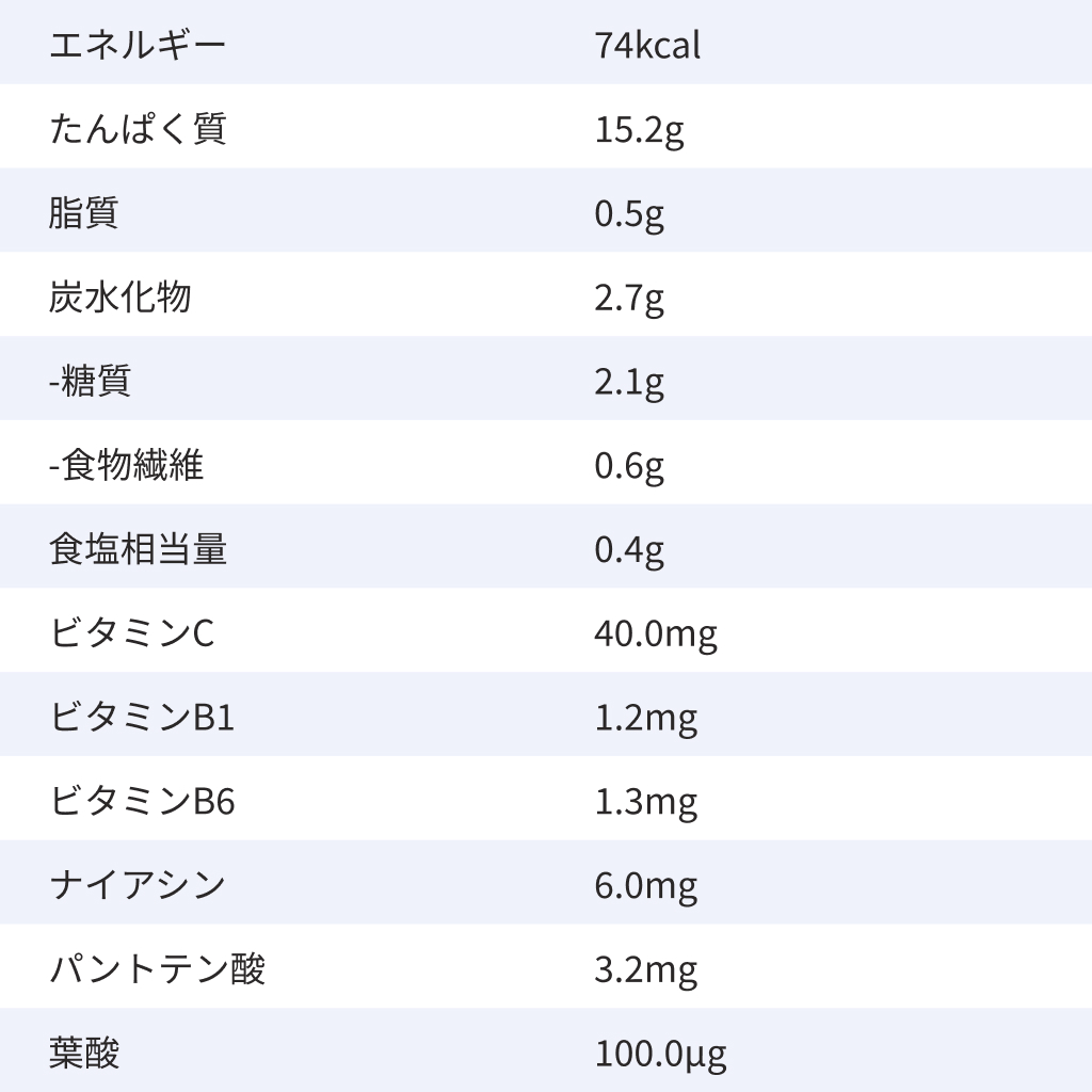 エネルギー 74kcal たんぱく質 15.2g 脂質 0.5g 炭水化物 2.7g -糖質 2.1g -食物繊維 0.6g 食塩相当量 0.4g ビタミンC 40.0mg ビタミンB1 1.2mg ビタミンB6 1.3mg ナイアシン 6.0mg パントテン酸 3.2mg 葉酸 100.0μg