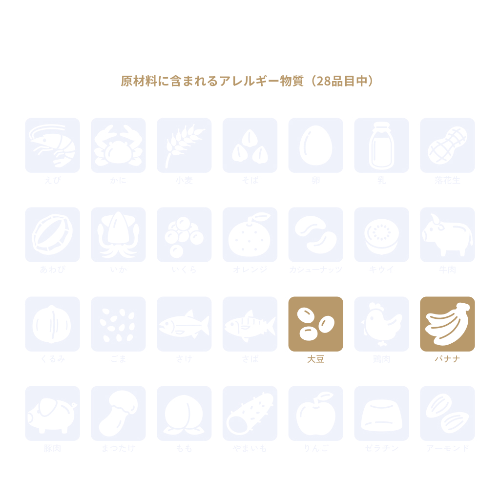 大豆たんぱく (米国製造)、バナナパウダー、 難消化性デキストリン、マルチトール、パラチノース、デキストリン/香料、植物レシチン、甘味料(ステビア)、クエン酸、V.C、ナイアシン、パントテン酸Ca、V.B6、V.B1、葉酸