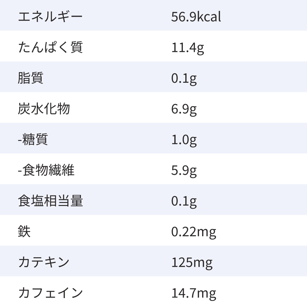 熱量 56.9kcal たんぱく質 11.4g 脂質 0.1g 炭水化物 6.9g -糖質 1.0g -食物繊維 5.9g 食塩相当量 0.1g 鉄 0.22mg カテキン 125mg カフェイン 14.7mg