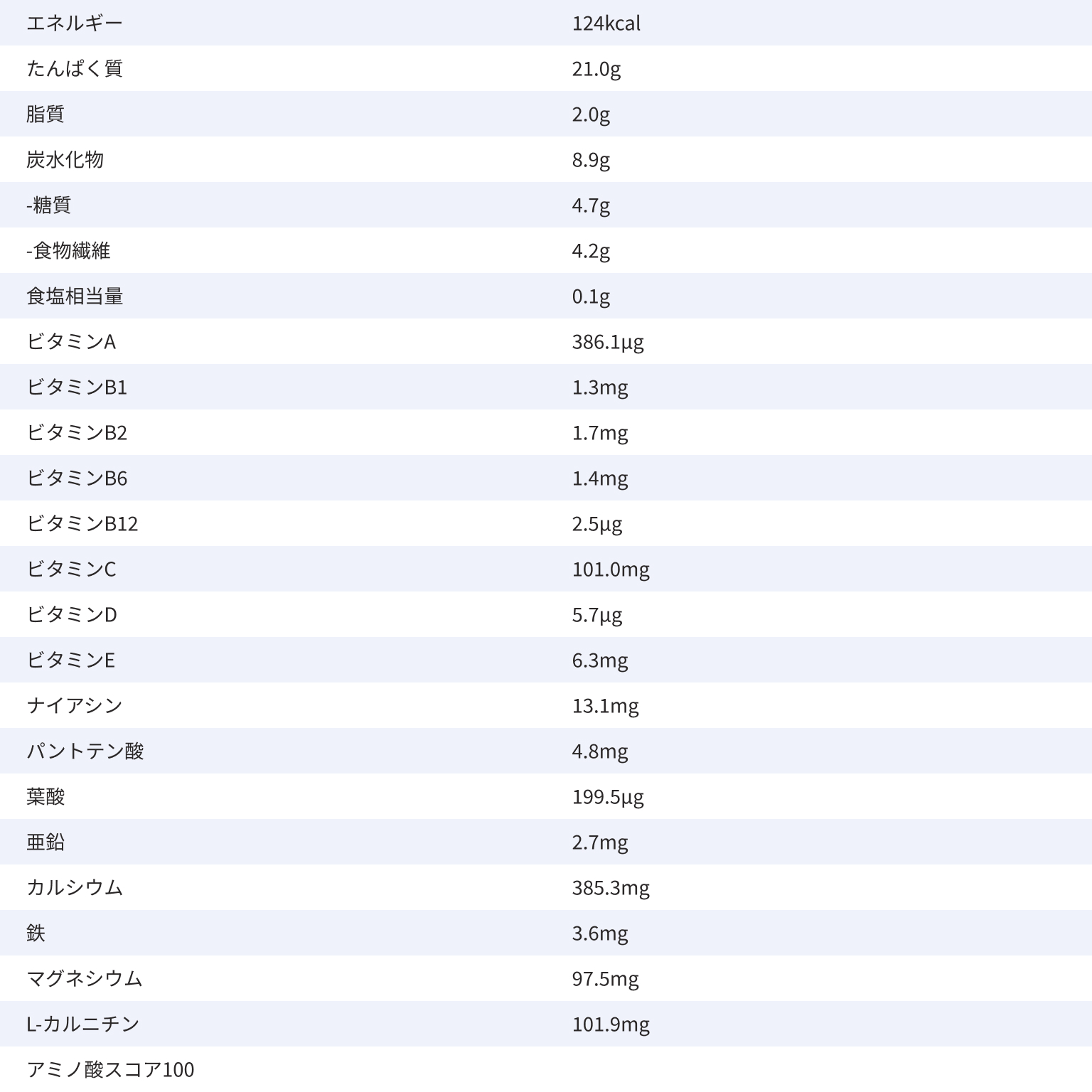 エネルギー 124kcal たんぱく質 21.0g 脂質 2.0g 炭水化物 8.9g -糖質 4.7g -食物繊維 4.2g 食塩相当量 0.1g ビタミンA 386.1μg ビタミンB1 1.3mg ビタミンB2 1.7mg ビタミンB6 1.4mg ビタミンB12 2.5μg ビタミンC 101.0mg ビタミンD 5.7μg ビタミンE 6.3mg ナイアシン 13.1mg パントテン酸 4.8mg 葉酸 199.5μg 亜鉛 2.7mg カルシウム 385.3mg 鉄 3.6mg マグネシウム 97.5mg L-カルニチン 101.9mg アミノ酸スコア 100