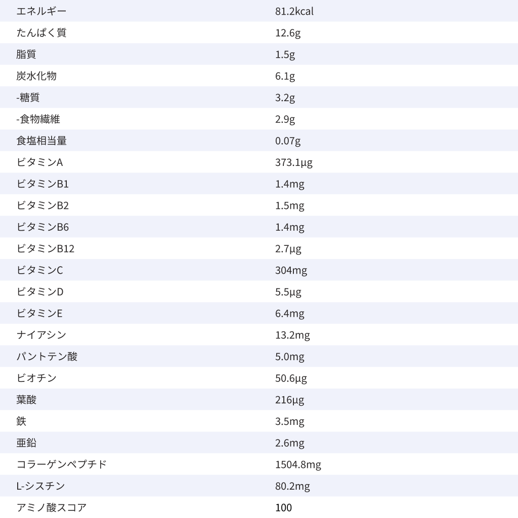 エネルギー 81.2kcal たんぱく質 12.6g 脂質 1.5g 炭水化物 6.1g -糖質 3.2g -食物繊維 2.9g 食塩相当量 0.07g ビタミンA 373.1μg ビタミンB1 1.4mg ビタミンB2 1.5mg ビタミンB6 1.4mg ビタミンB12 2.7μg ビタミンC 304mg ビタミンD 5.5μg ビタミンE 6.4mg ナイアシン 13.2mg パントテン酸 5.0mg ビオチン 50.6μg 葉酸 216μg 鉄 3.5mg 亜鉛 2.6mg コラーゲンペプチド 1504.8mg L-シスチン 80.2mg アミノ酸スコア 100