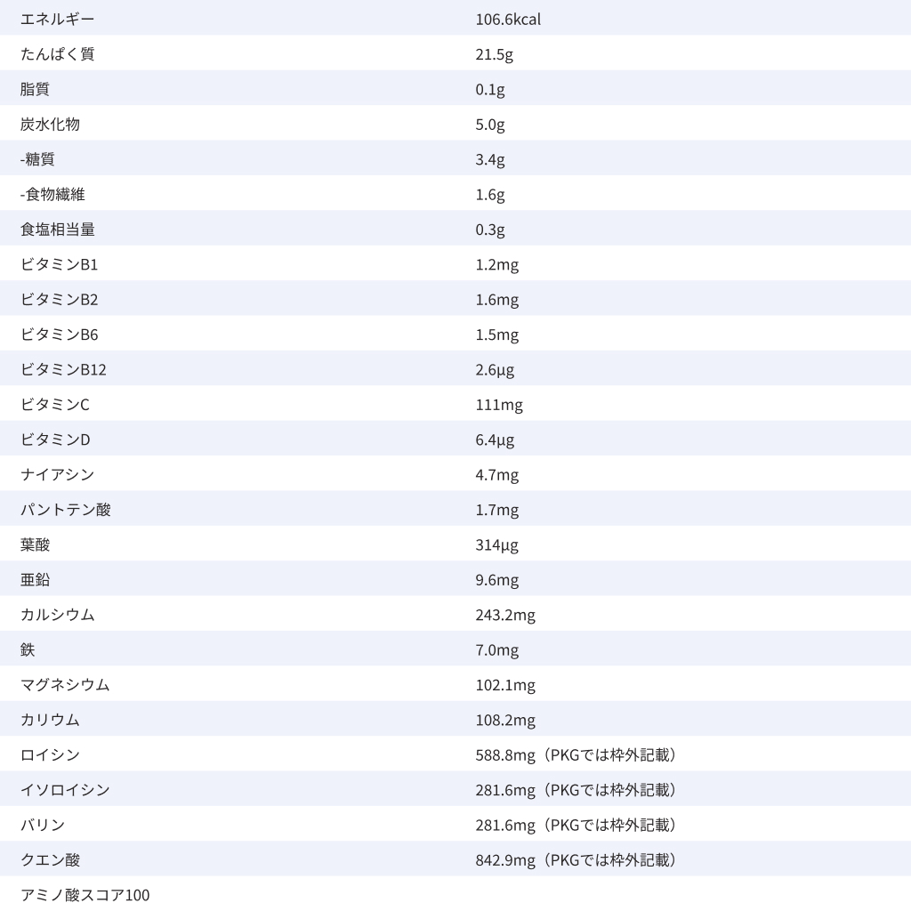 エネルギー 106.6kcal たんぱく質 21.5g 脂質 0.1g 炭水化物 5.0g ー糖質 3.4g ー食物繊維 1.6g 食塩相当量 0.3g ビタミンB1 1.2mg ビタミンB2 1.6mg ビタミンB6 1.5mg ビタミンB12 2.6μg ビタミンC 111mg ビタミンD 6.4μg ナイアシン 4.7mg パントテン酸 1.7mg 葉酸 314μg 亜鉛 9.6mg カルシウム 243.2mg 鉄 7.0mg マグネシウム 102.1mg カリウム 108.2mg ロイシン 588.8mg(PKGでは枠外記載) イソロイシン 281.6mg(PKGでは枠外記載) バリン 281.6mg(PKGでは枠外記載) クエン酸 842.9mg(PKGでは枠外記載) アミノ酸スコア 100