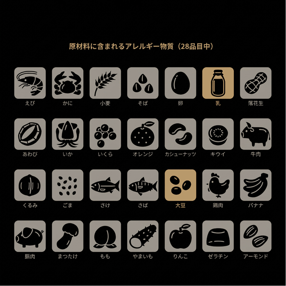 乳清たんぱく(乳成分を含む)(ニュージーランド製造)、食物繊維(ポリデキストロース)、ガラクトオリゴ糖、難消化性デキストリン、ココアパウダー、乳等を主要原料とする食品、L-カルニチン、食塩、乳酸菌粉末(でん粉、乳酸菌(加熱処理))、加工油脂、亜鉛含有酵母/香料、炭酸カルシウム、乳化剤(大豆由来)、甘味料(ステビア)、酸化マグネシウム、V.C、クエン酸カリウム、ピロリン酸鉄、ナイアシン、V.E、パントテン酸カルシウム、V.B1、V.B2、V.B6、V.A、葉酸、V.D、V.B12